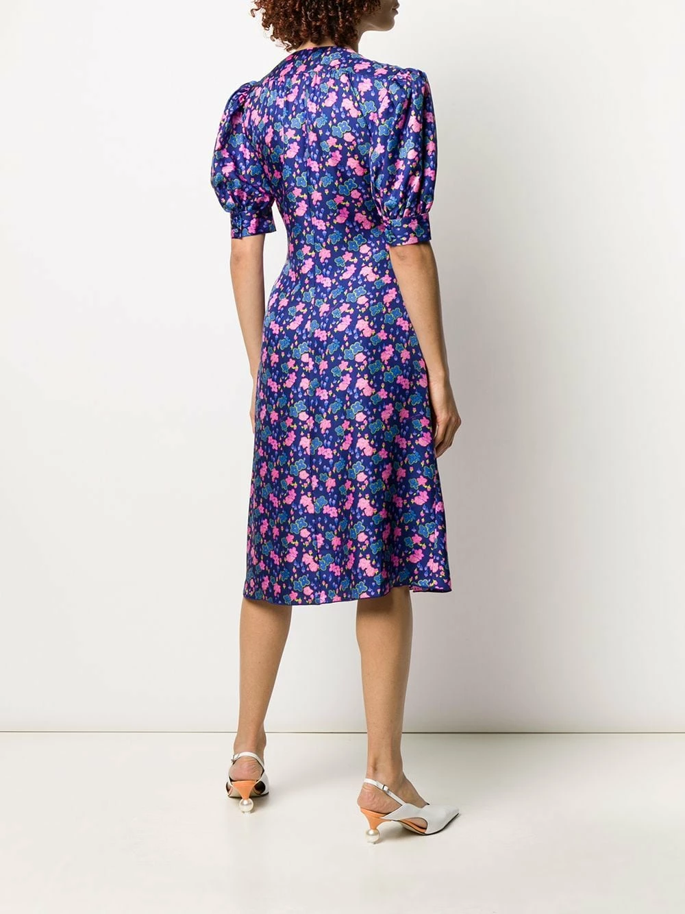 Robe mi-longue à fleurs en soie Marc Jacobs avec col v à design cache-cœur, manches mi-longues, poignets boutonnés, ceinture nouée et longueur medium. Couleur : bleu.