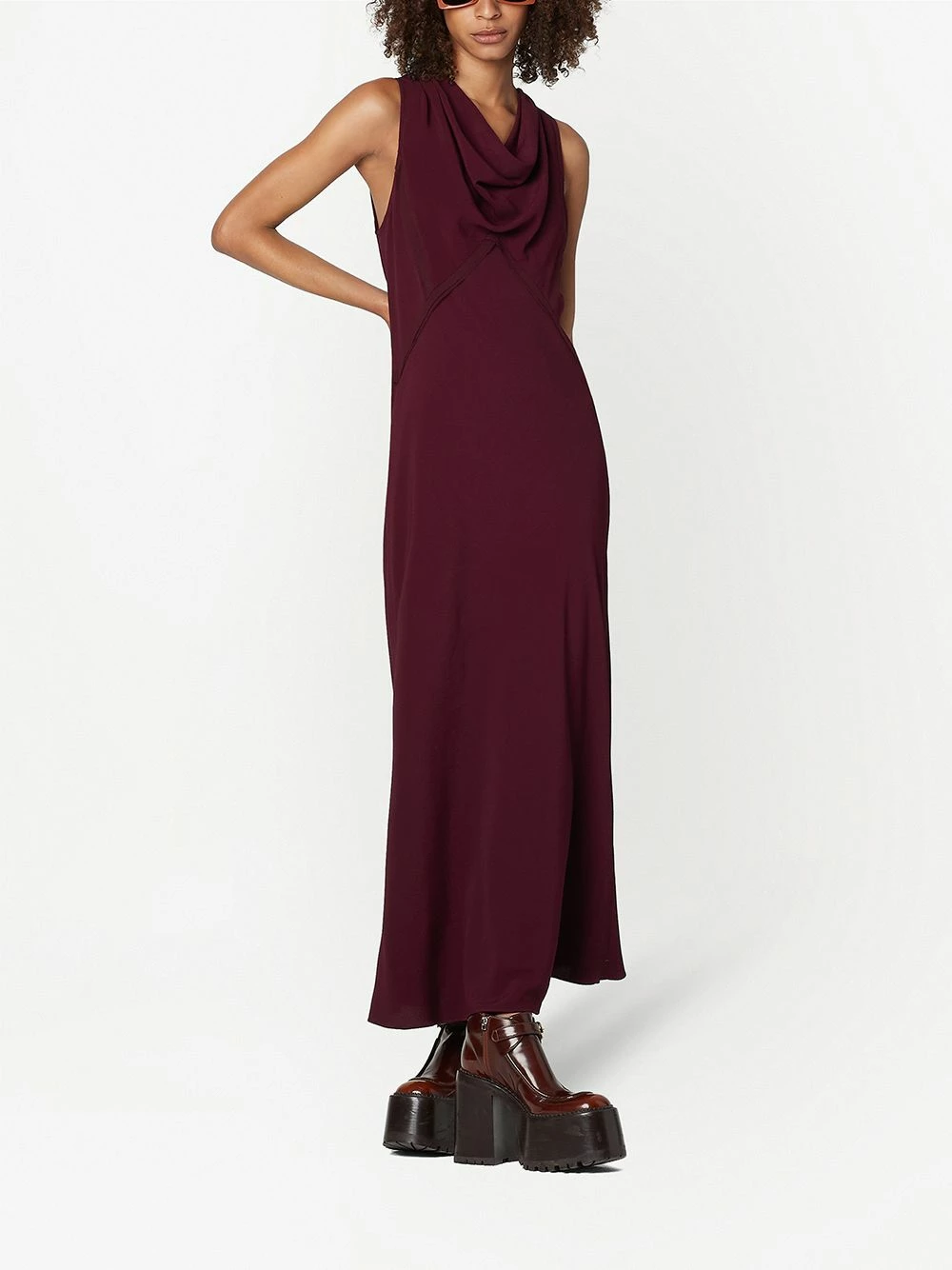 Col bénitier, boutonnière à l’arrière, design sans manches, coupe évasée, ourlet droit, longueur mollet.
