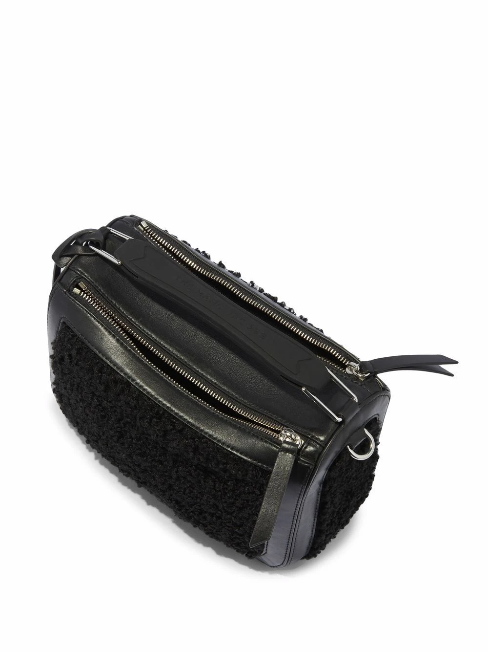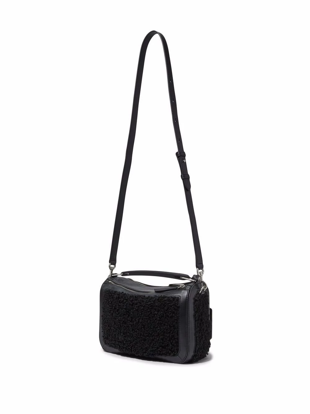 Design en peau lainée artificielle, étiquette en cuir, fermeture zippée sur le dessus, anse plate sur le dessus, bride porté épaule détachable et ajustable. Couleur : noir.