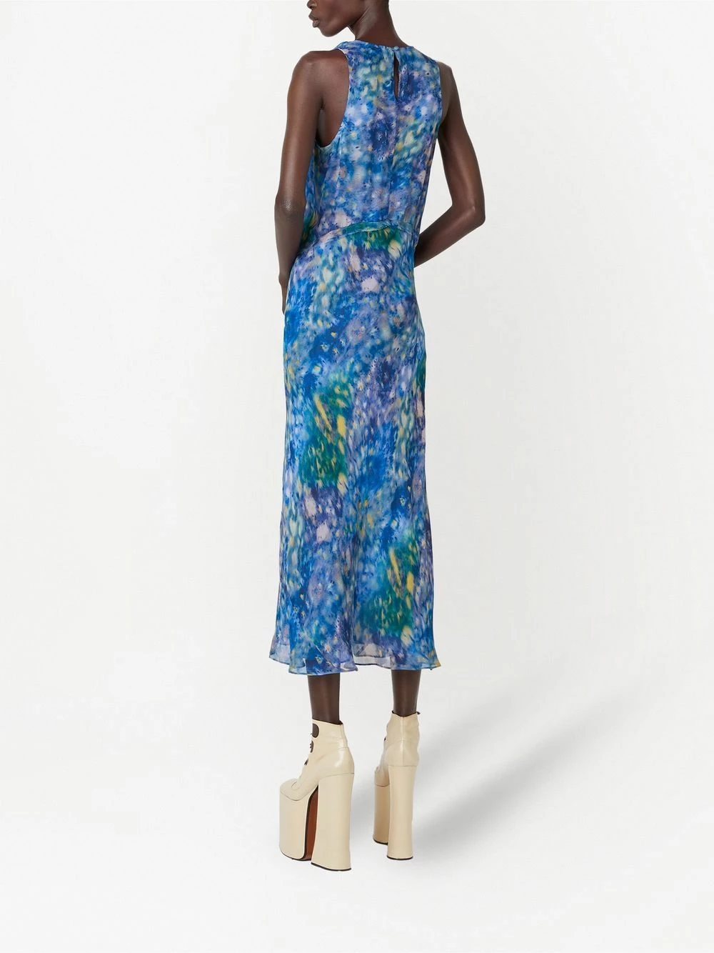 Imprimé graphique intégral, détails de fronces, col bénitier, design sans manches, ourlet évasé, longueur au dessous du genou. Couleur : bleu. Matière : soie.
