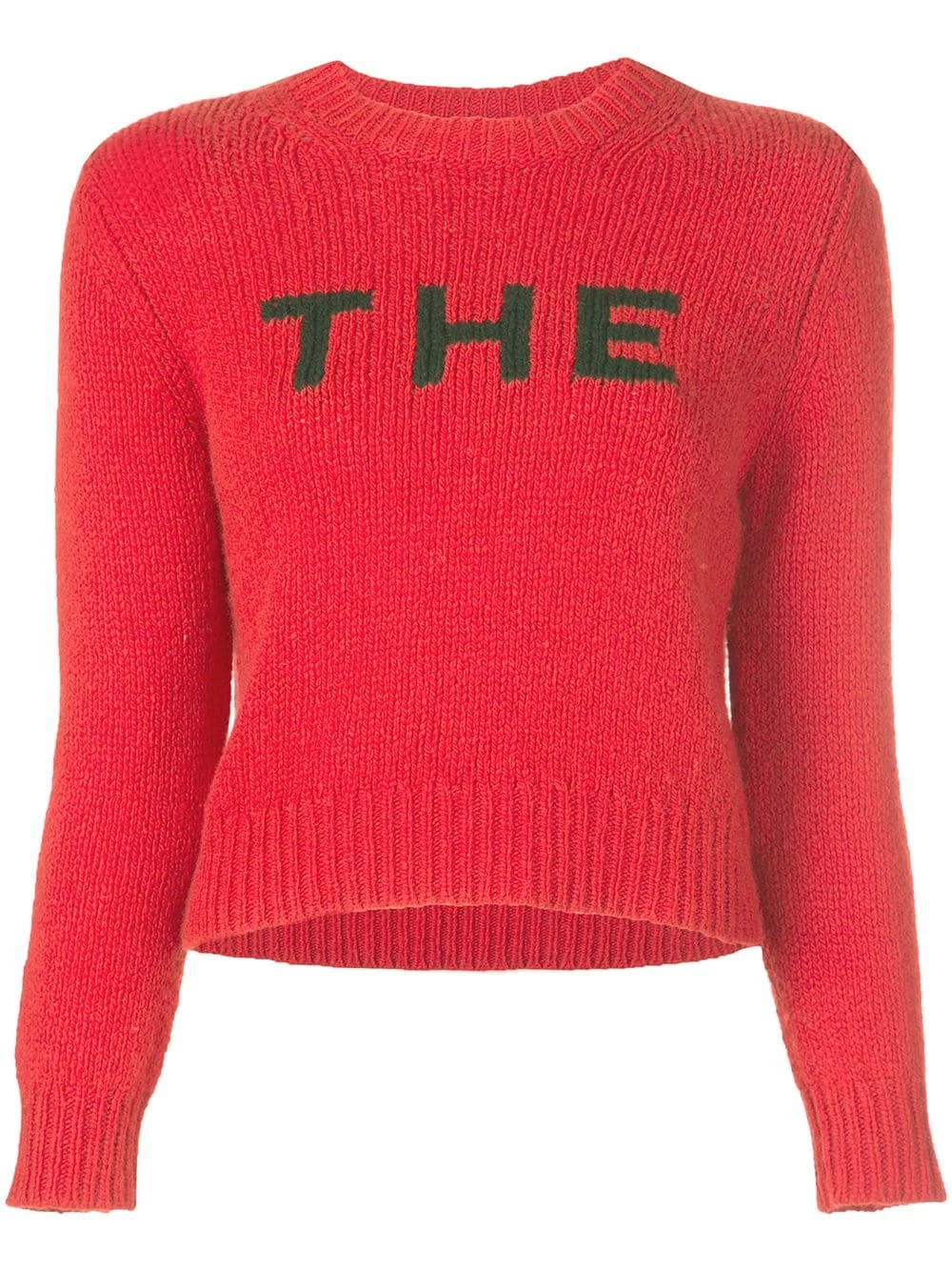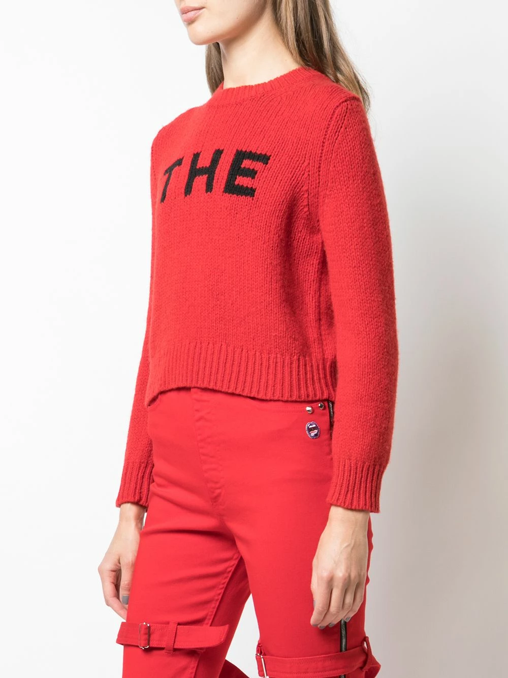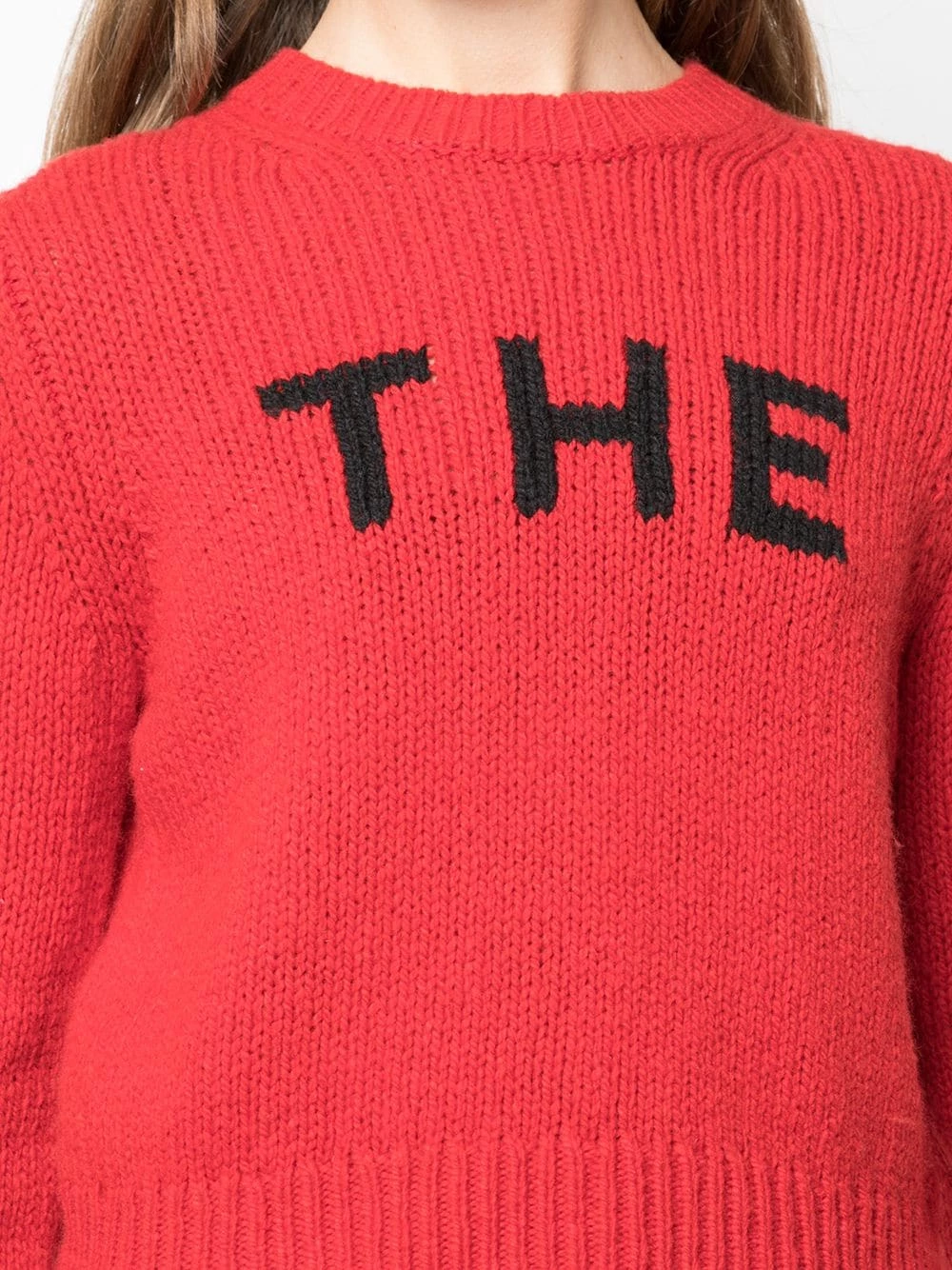 Pull en maille intarsia Marc Jacobs avec encolure ras du cou nervurée, manches longues et ourlet et poignets nervurés. Couleur : rouge.