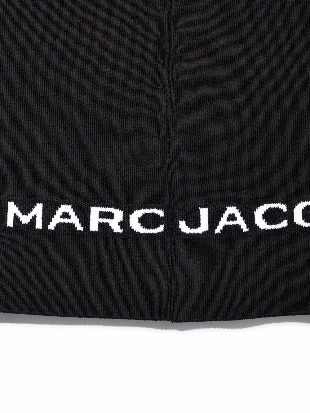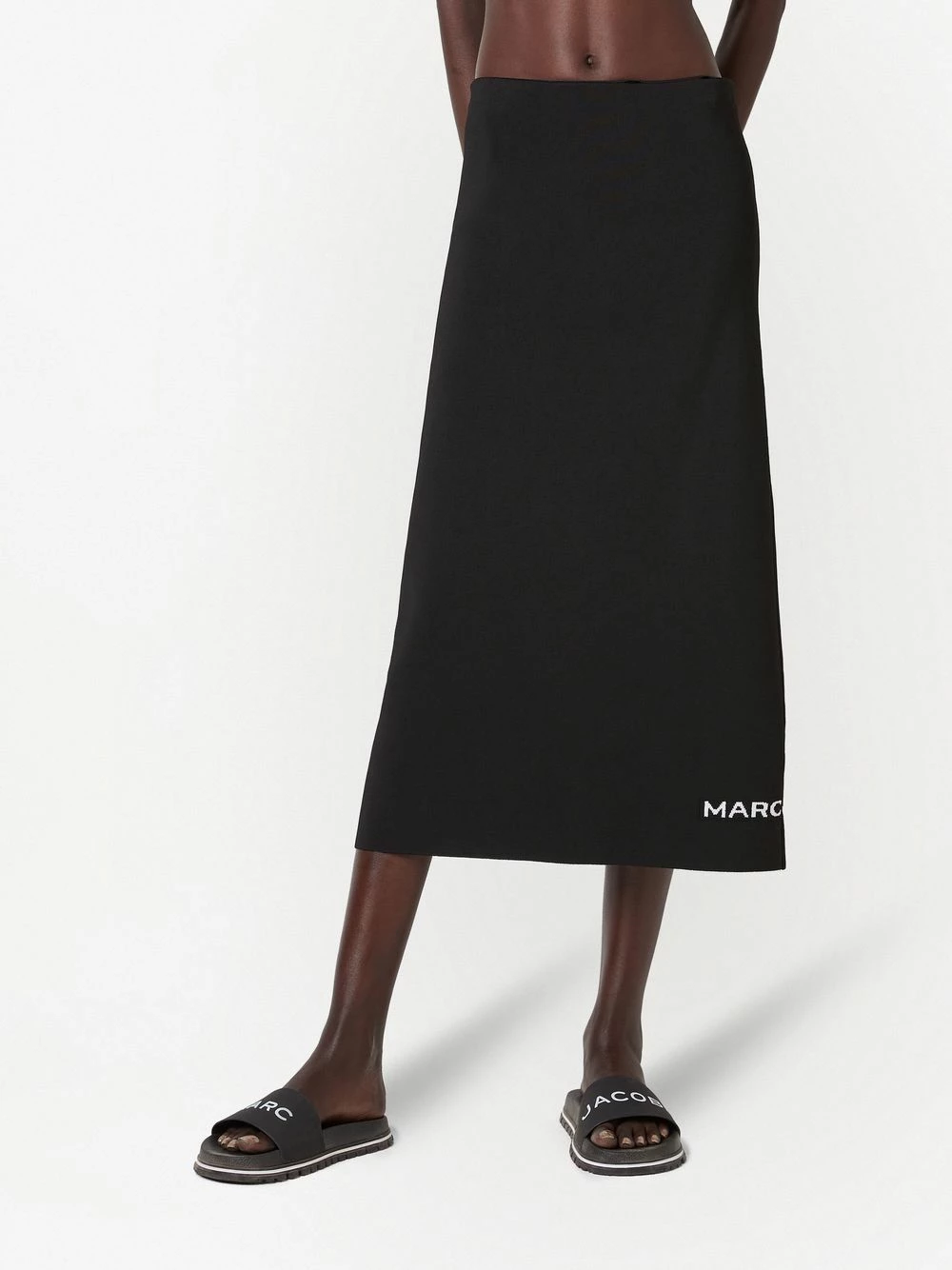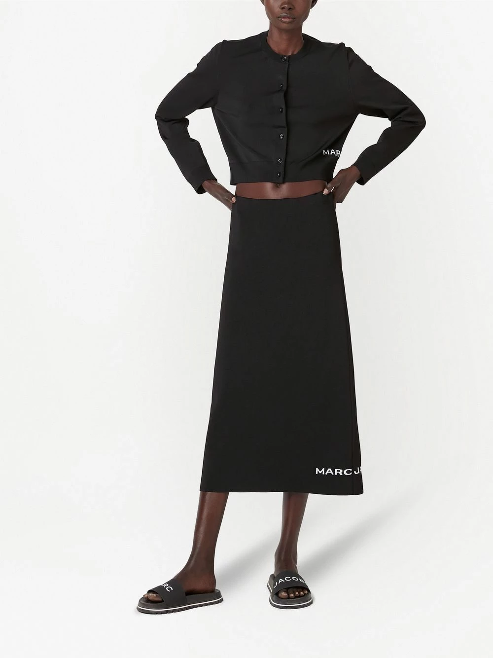Design en maille, logo intarsia, taille haute, hauteur genou. Couleur : noir.