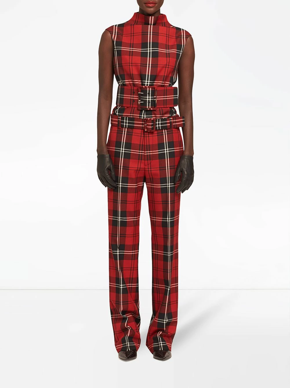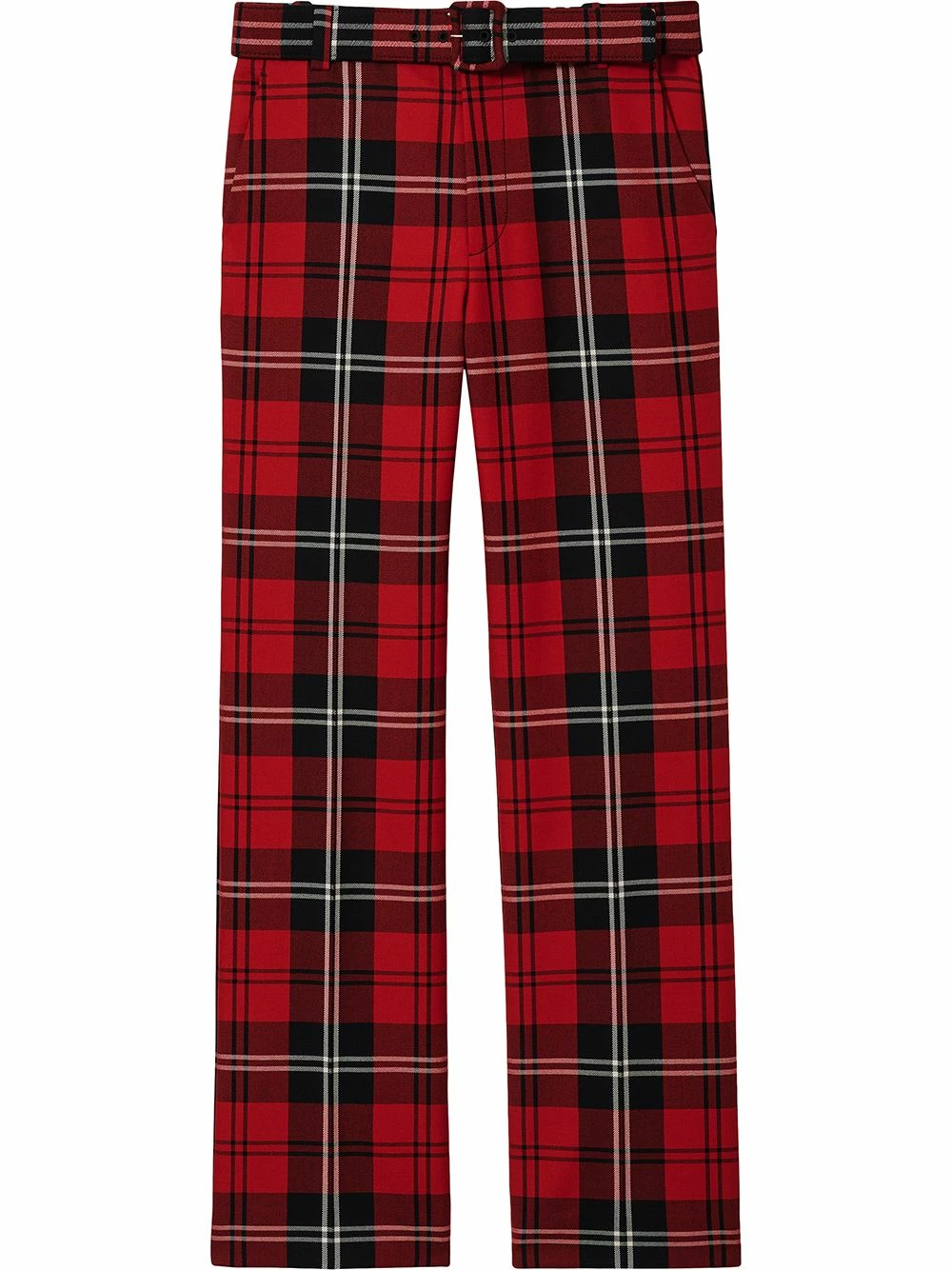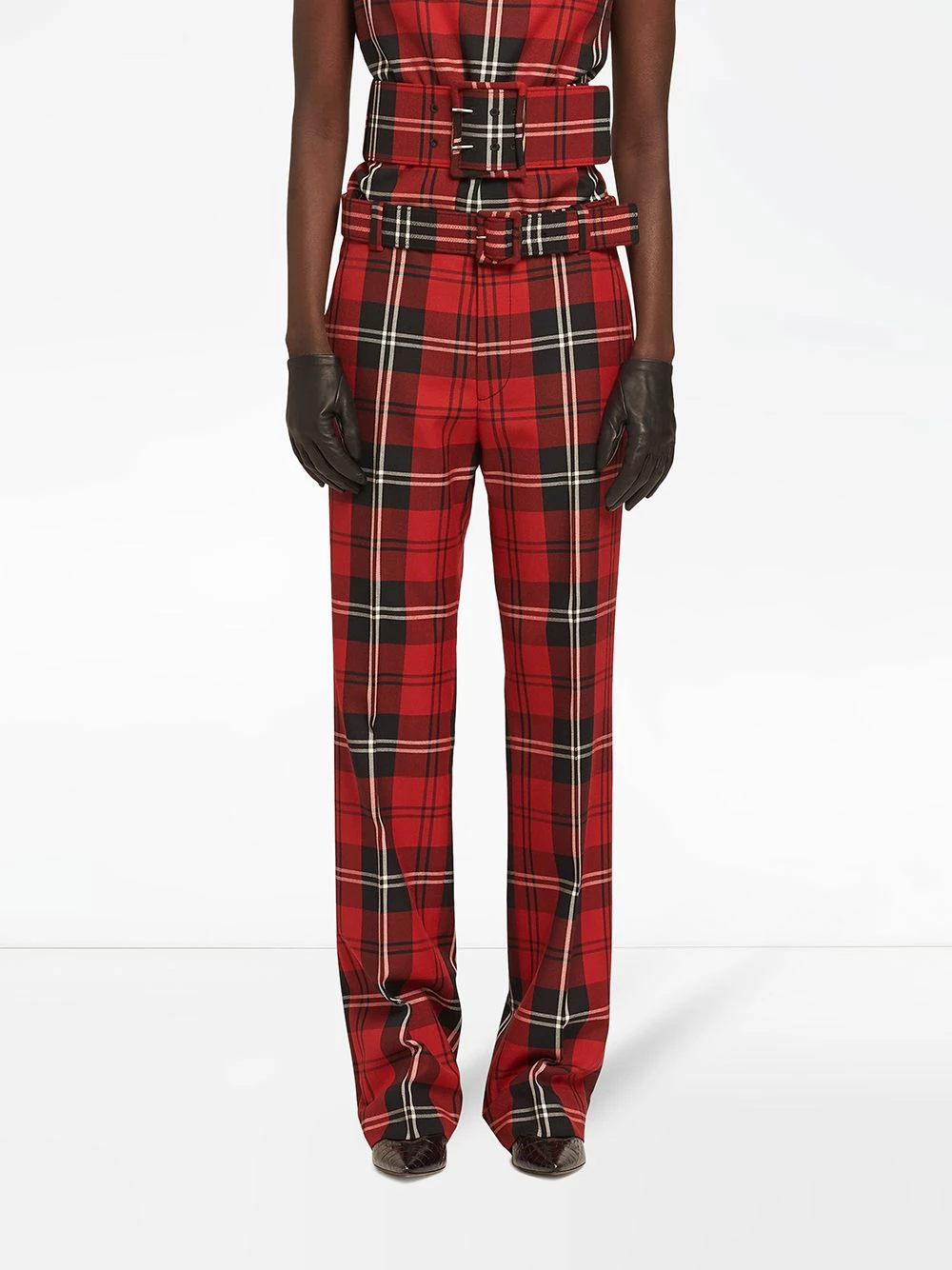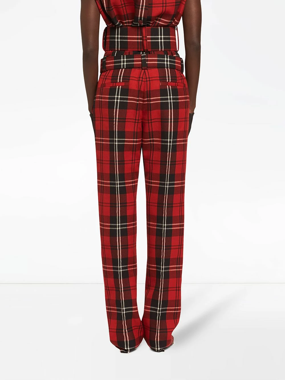 Carreaux, coupe droite, taille haute, taille ceinturée. Couleur : rouge. Matière : laine.