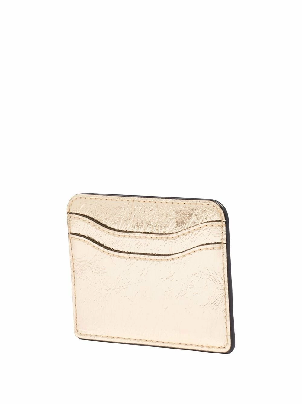 Fini métallisé, logo imprimé sur le devant, forme rectangulaire, fentes pour carte. Couleur : or.