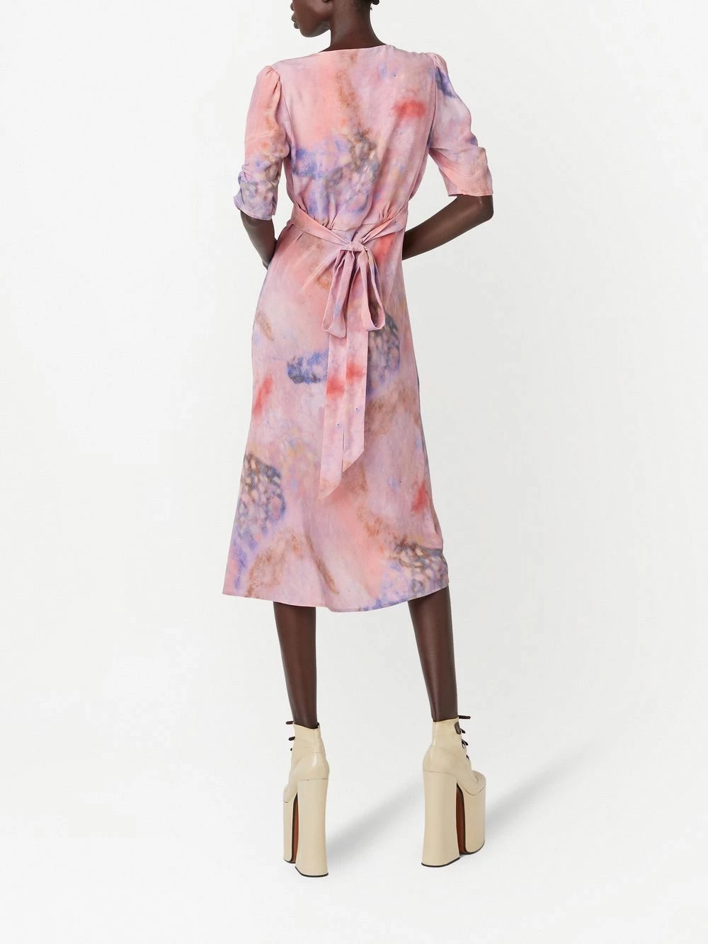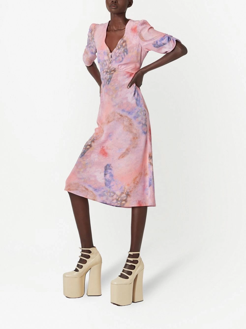 Imprimé graphique intégral, col v, manches courtes, jupe évasée. Couleur : rose. Matière : soie.
