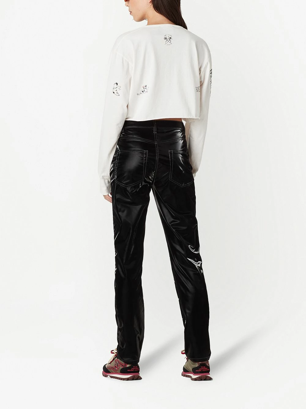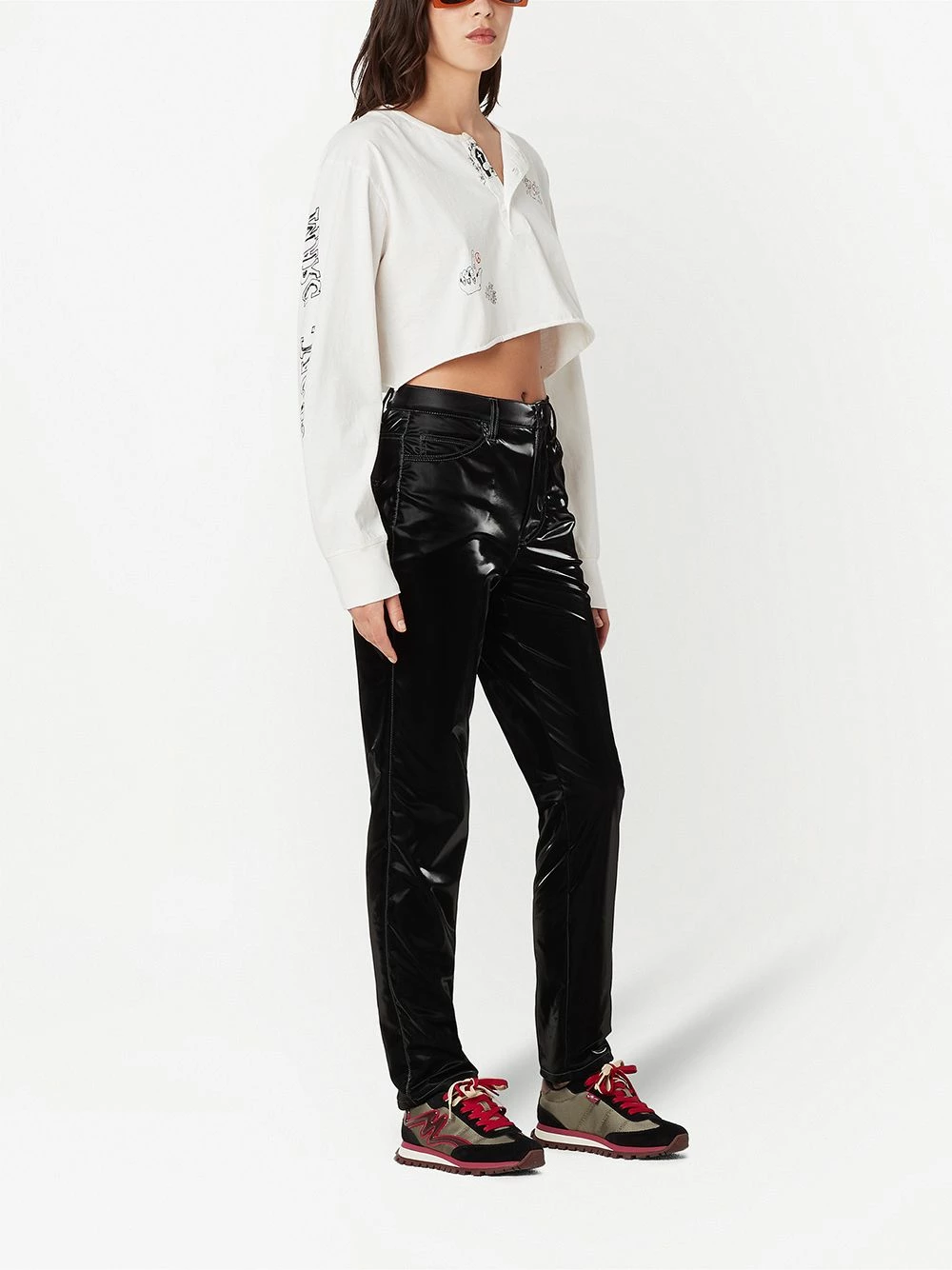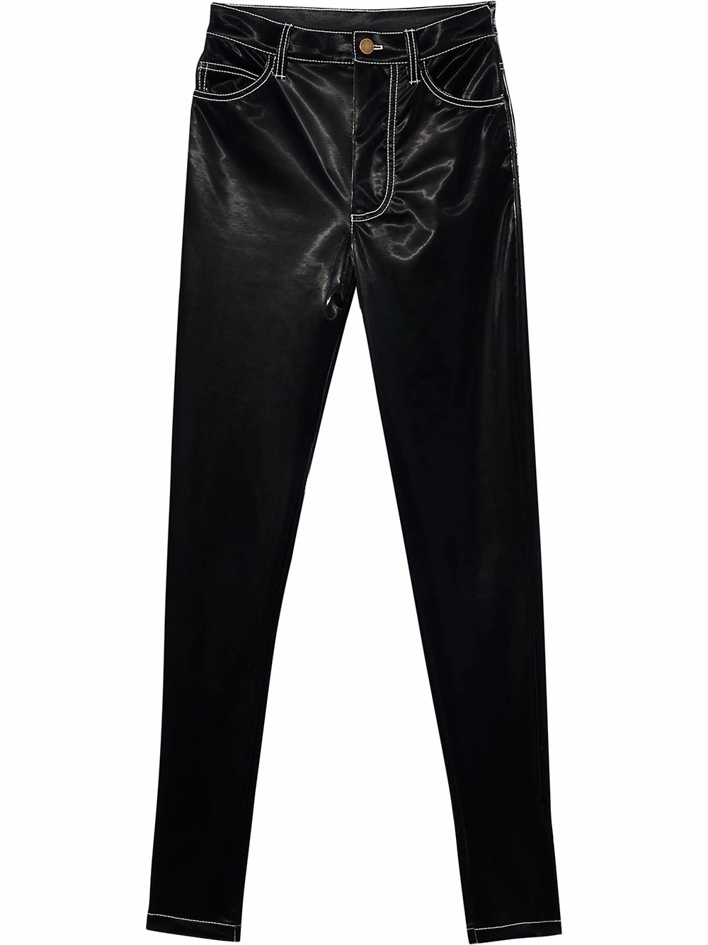 Fini verni, coutures contrastantes, taille haute, fermeture boutonnée, passants de ceinture, cinq poches classiques, coupe droite. Couleur : noir.