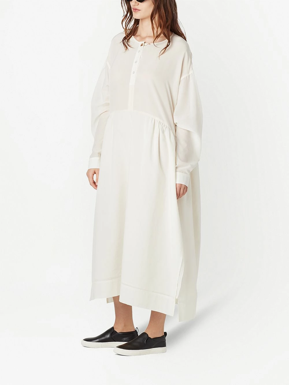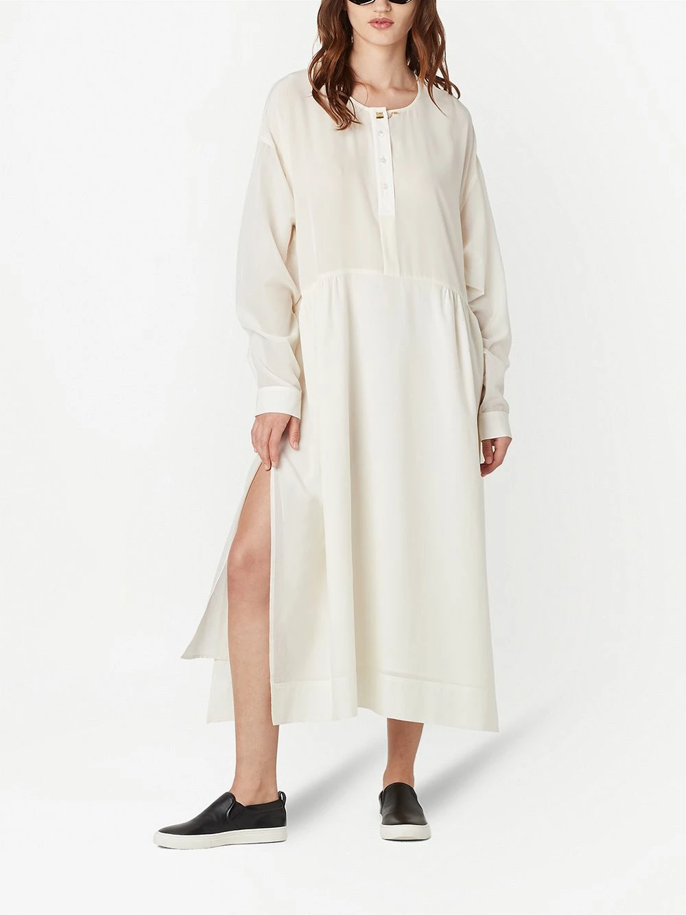Encolure ras du cou, patte de boutonnage sur le devant, effet d’épaules descendues, manches longues, fentes latérales, coupe mi-longue.