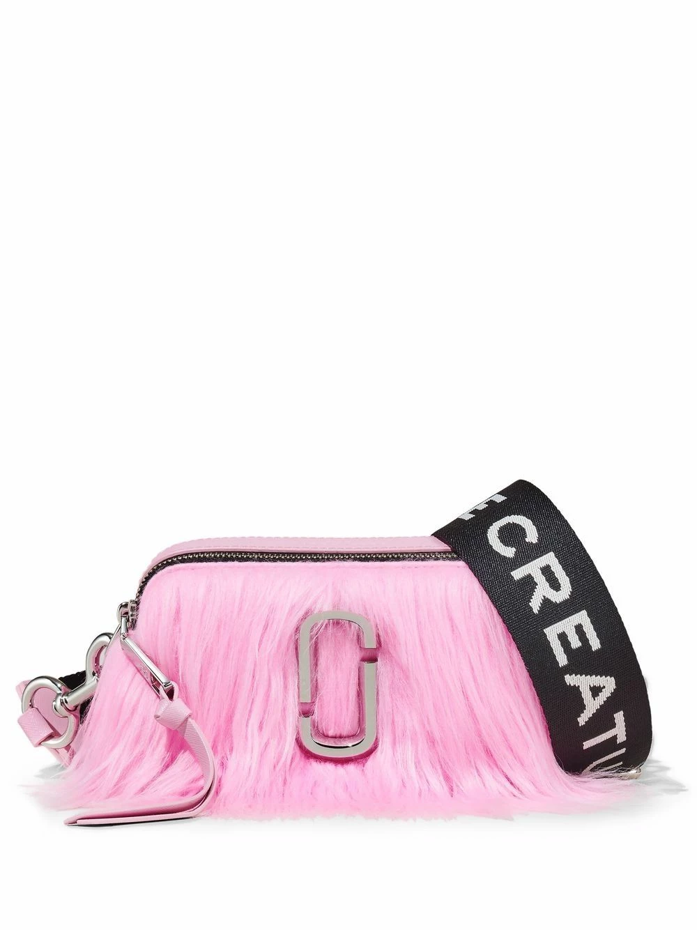 Détails en fourrure artificielle, plaque logo, finitions en métal argenté, bride porté épaule détachable et ajustable. Couleur : rose.
