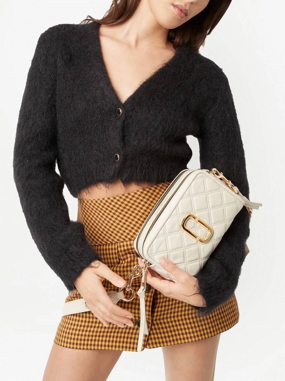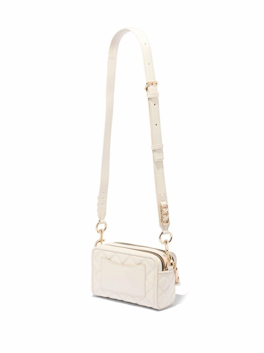 Bride porté épaule détachable et ajustable, deux compartiments zippés, finitions en métal doré, design matelassé, poche plaquée à l’arrière. Couleur : blanc. Matière : cuir.