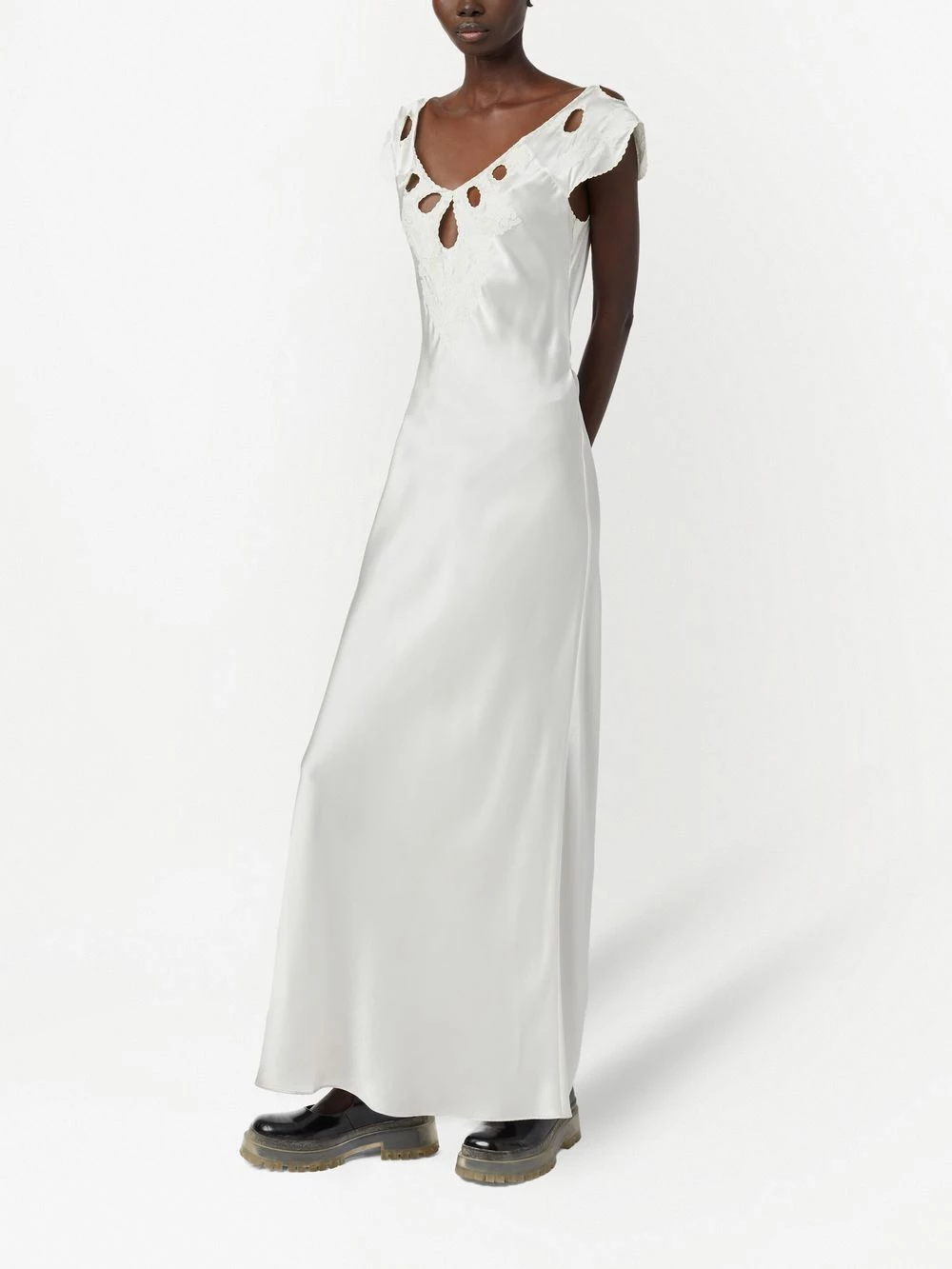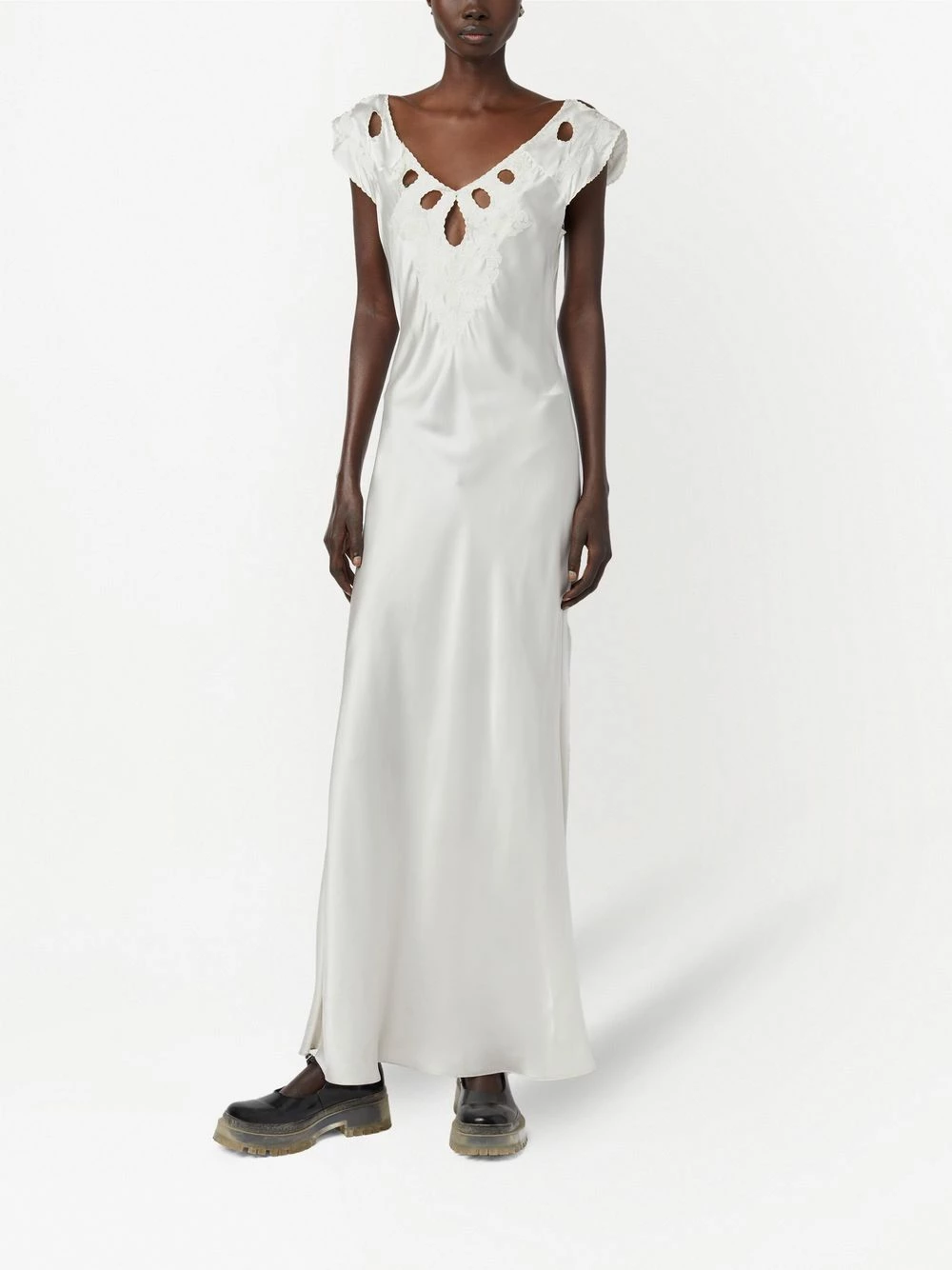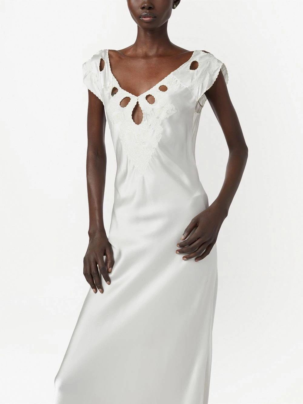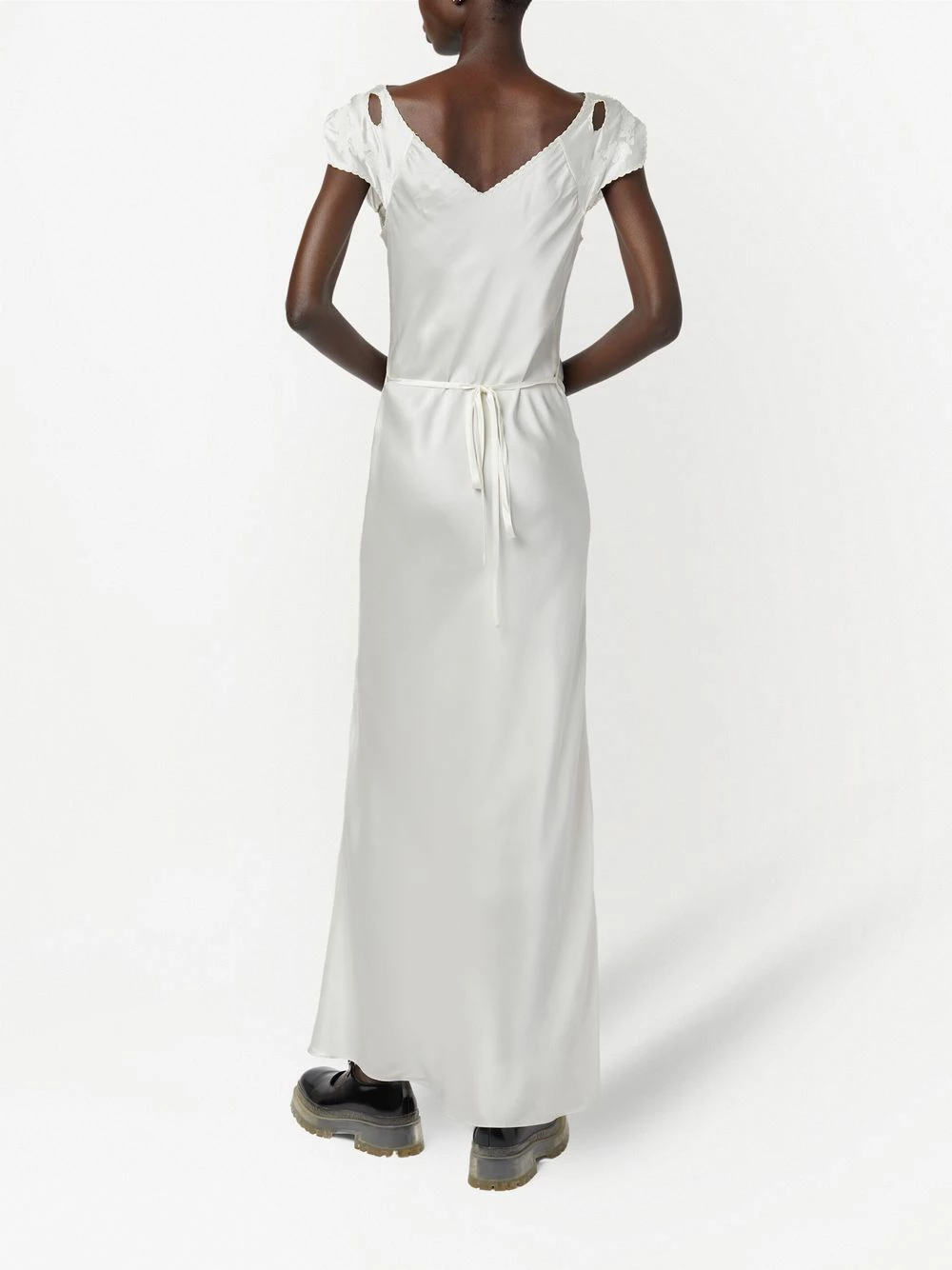 Détails de découpes, col à ouverture goutte d’eau, bordures festonnées, col v, manches courtes, coupe évasée, col v au dos, jupe longue, fermeture nouée au dos. Couleur : blanc. Matière : soie.