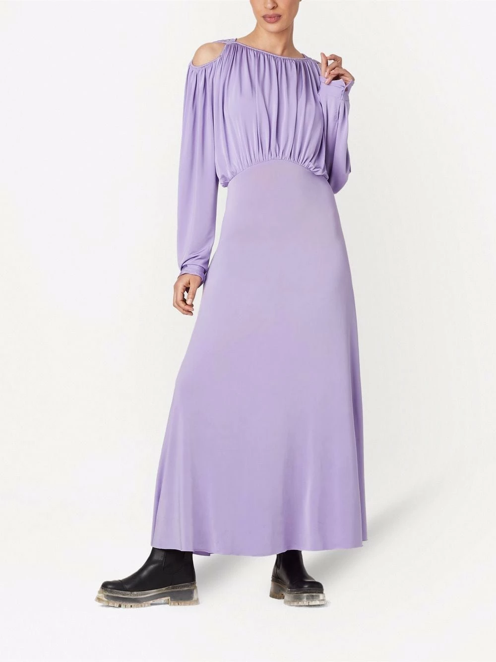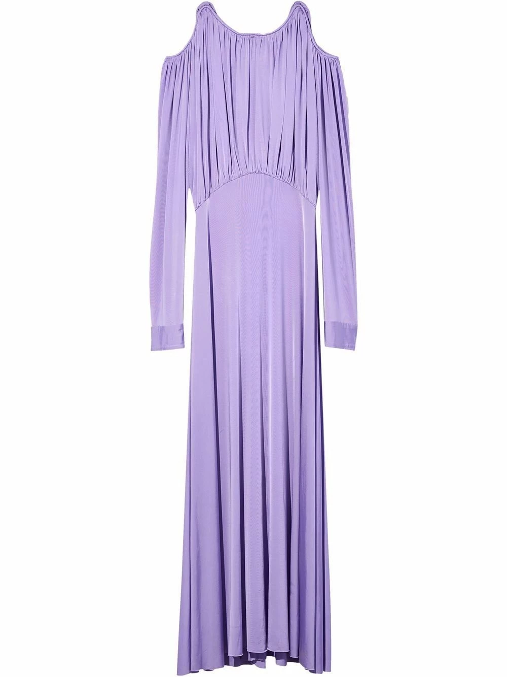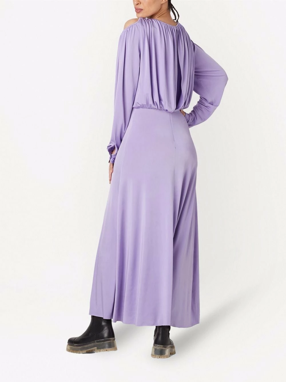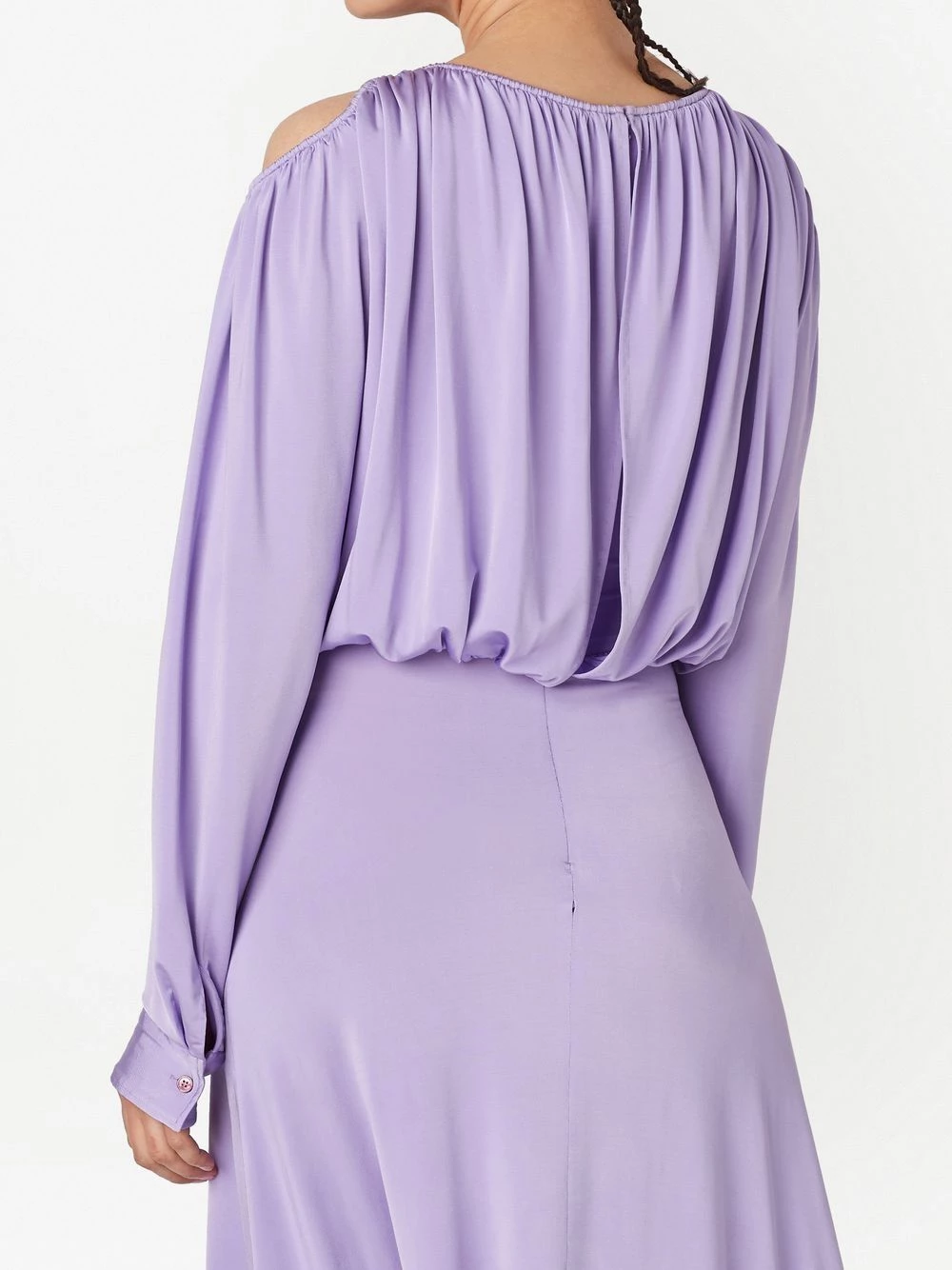 Détails de fronces, épaules dénudées, encolure ronde, fermeture arrière dissimulée, manches longues, poignets boutonnés, coupe longue.