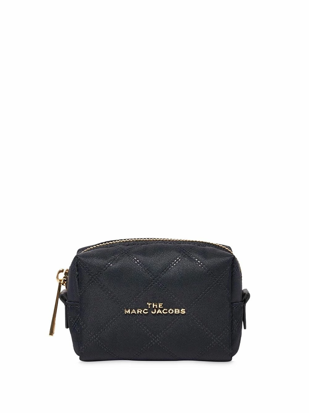 Pochette zippée à plaque logo Marc Jacobs avec fermeture zippée sur le dessus, logo doré et compartiment intérieur. Couleur : Noir.