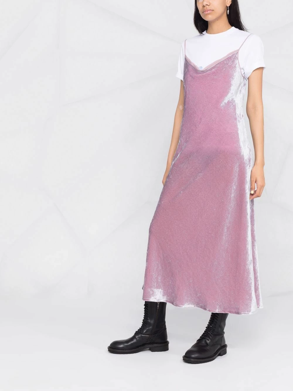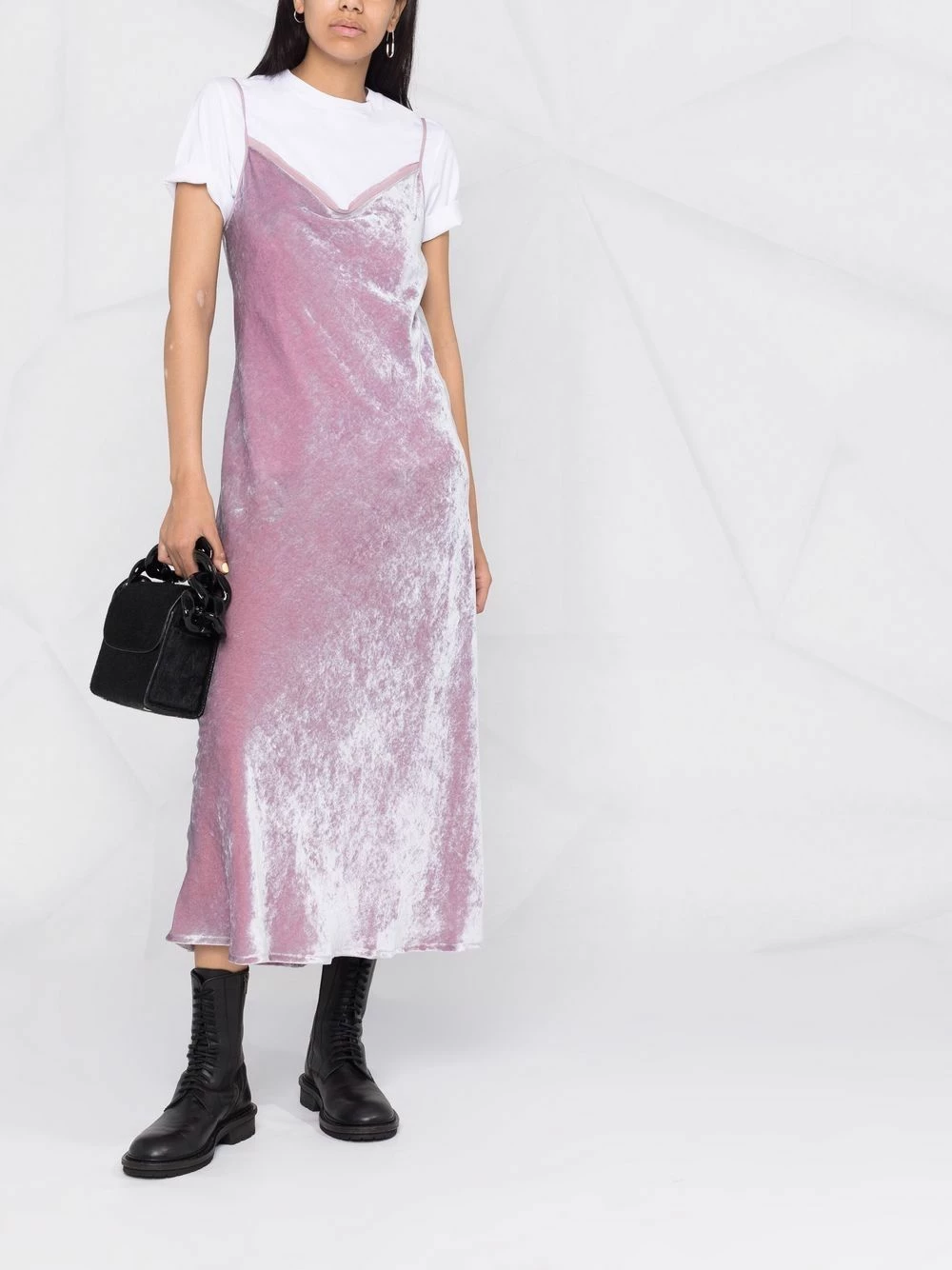 Effet velours, tissu coupé dans le biais, coupe évasée, col v. Matière : soie.