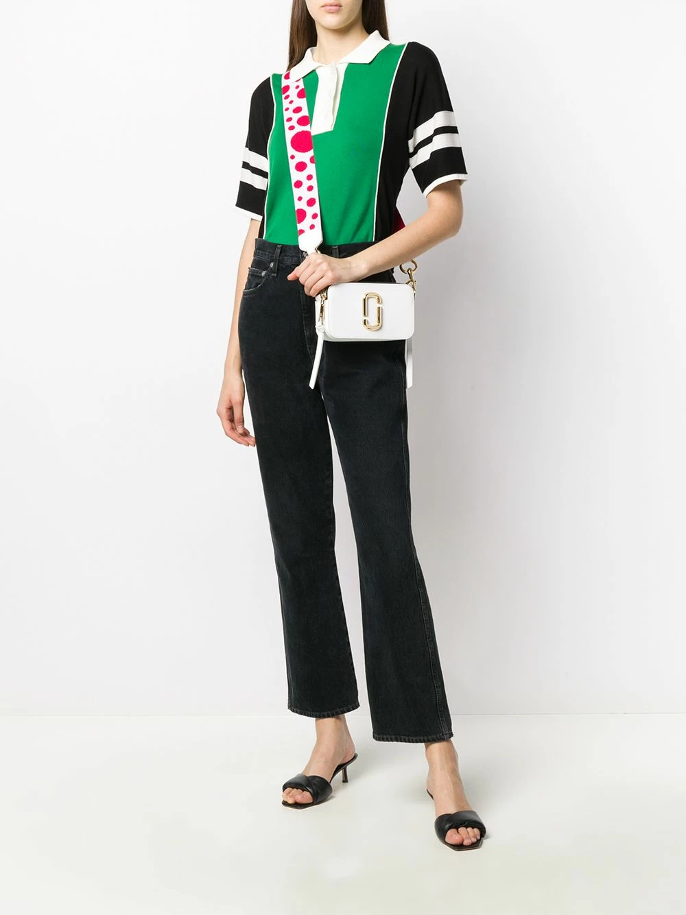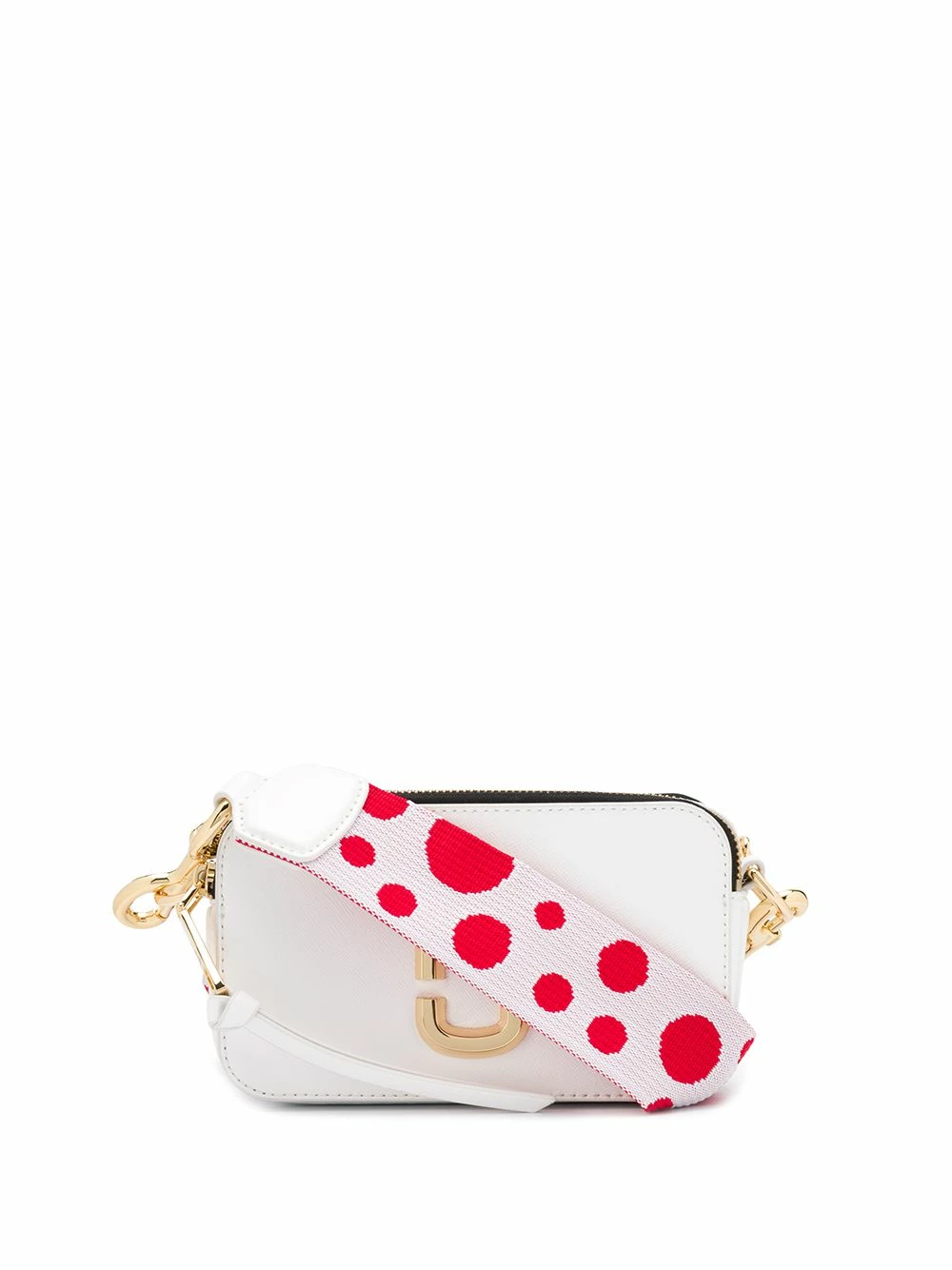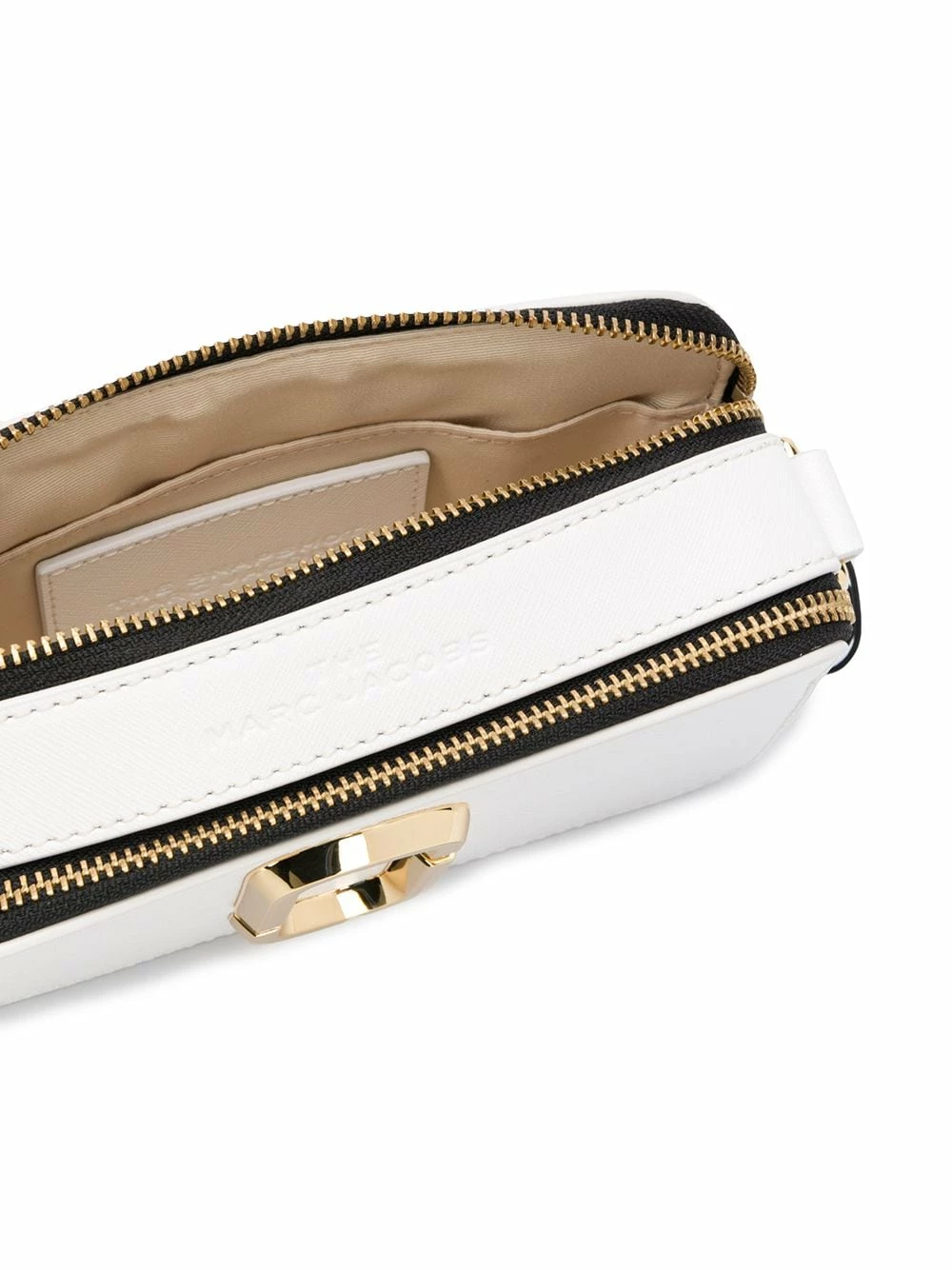 Sac à bandoulière Snapshot en cuir Marc Jacobs avec une fermeture zippée double sur le dessus, une plaque logo dorée, un logo gravé et bride portée épaule ajustable. Couleur : blanc.