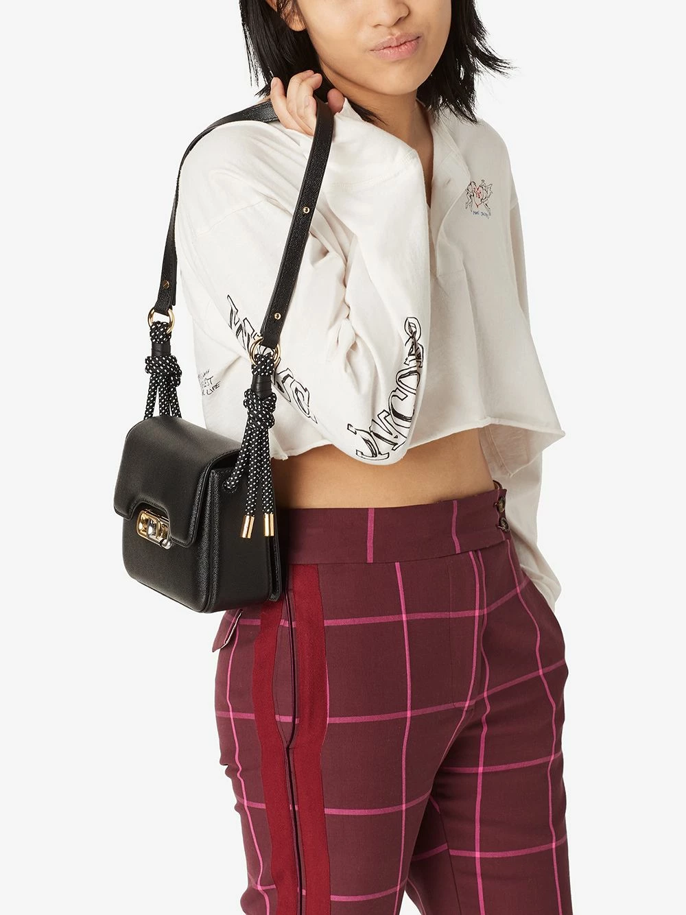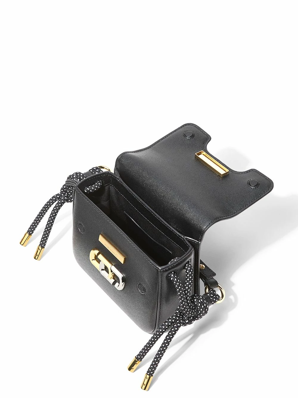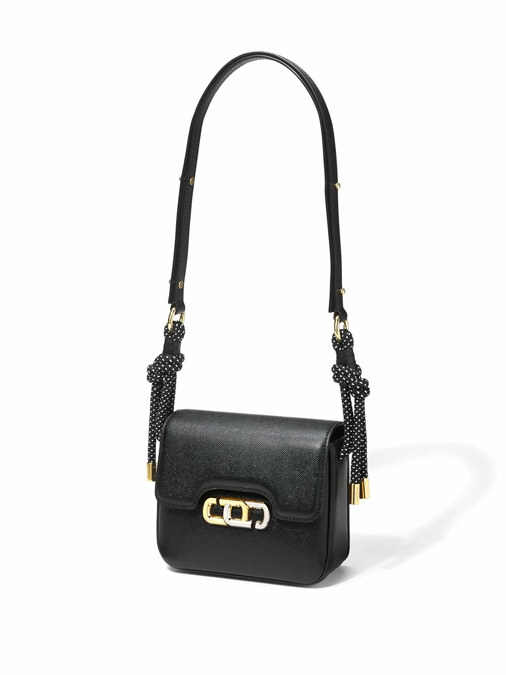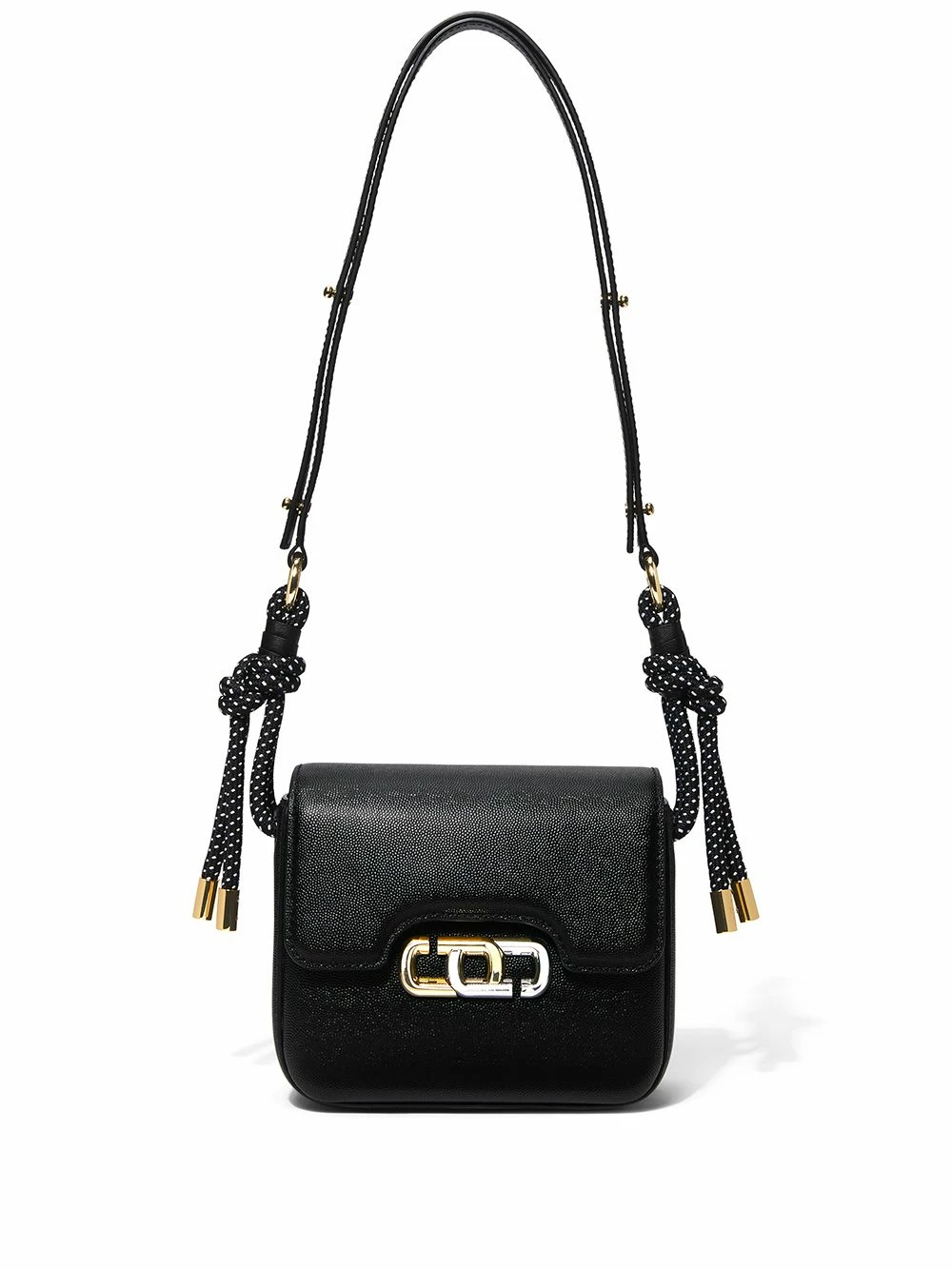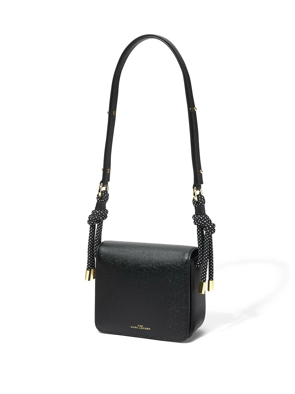 Détail de nœud, plaque logo, bride porté épaule ajustable, rabat sur le dessus à fermeture magnétique, compartiment principal, finitions en métal doré. Couleur : noir. Matière : cuir.
