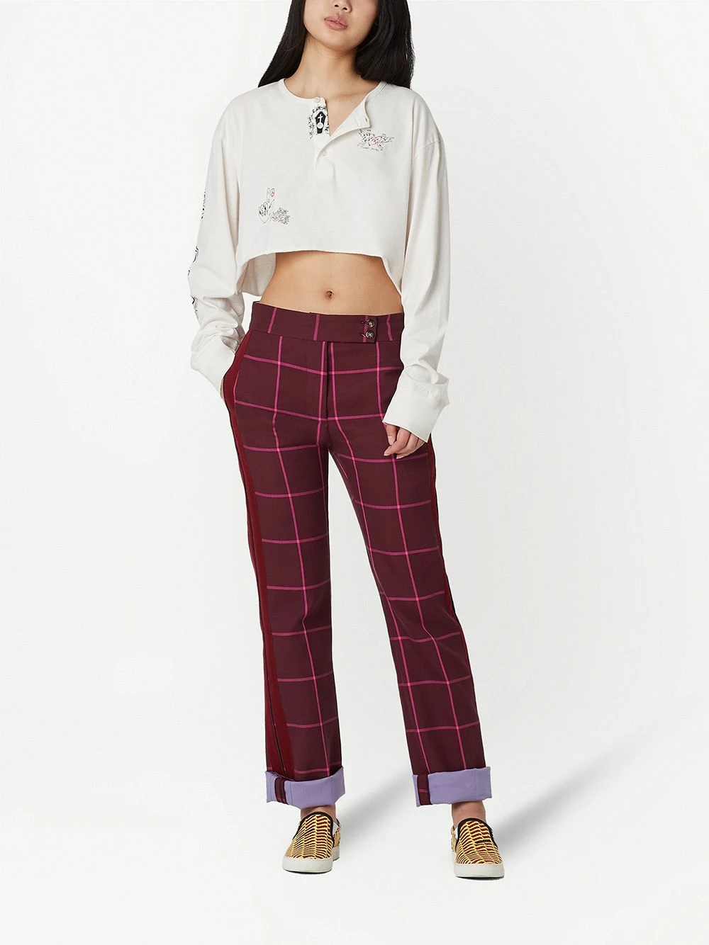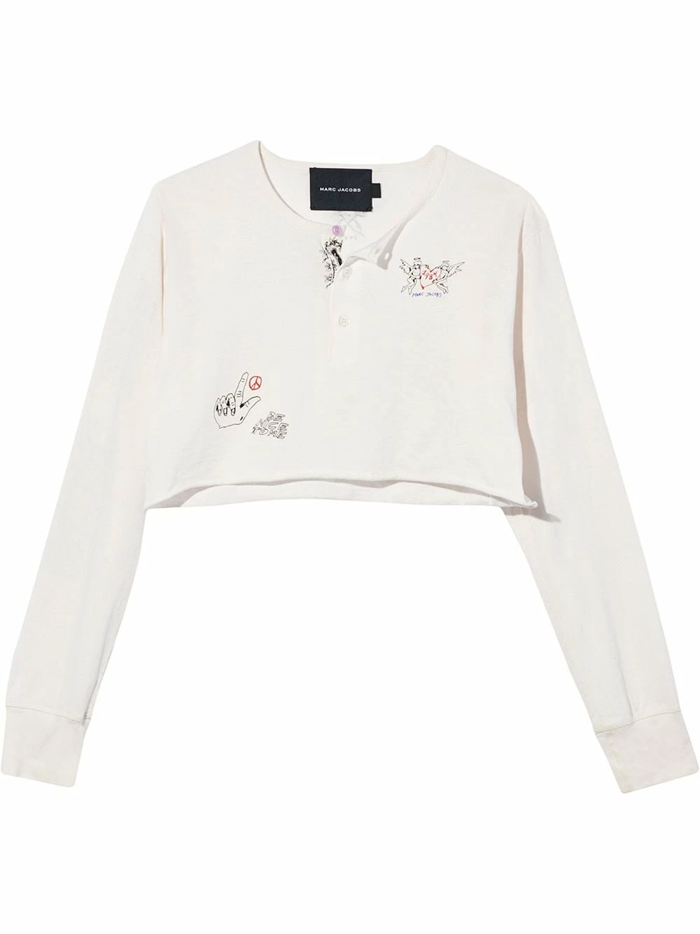 Tricot point jersey, imprimé façon tatouage, encolure ras du cou, boutonnière sur le devant, manches longues, coupe courte.