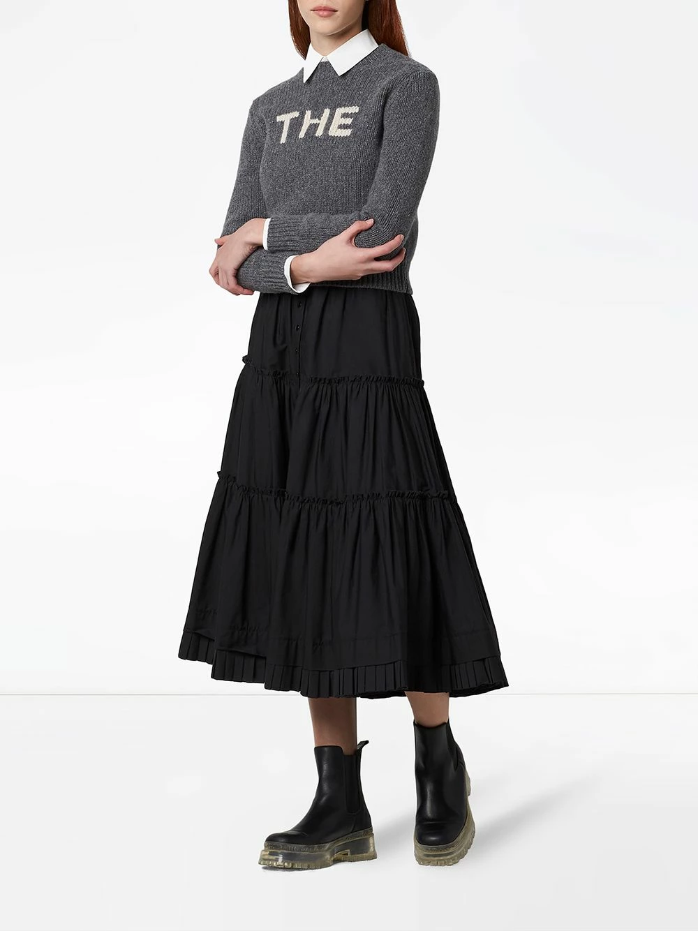 Détail nervuré, encolure ronde, manches longues, ourlet droit. Couleur : gris. Matière : laine.