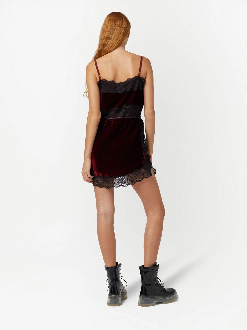 Effet velours, bordures festonnées, détails en dentelle, encolure carrée, fines bretelles, longueur au dessus du genou.