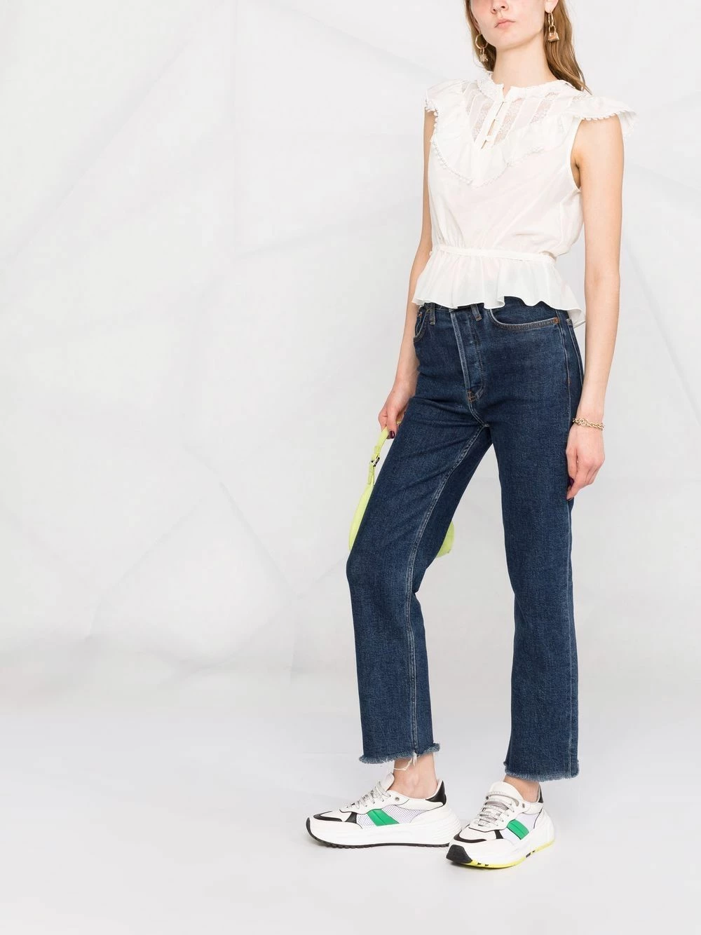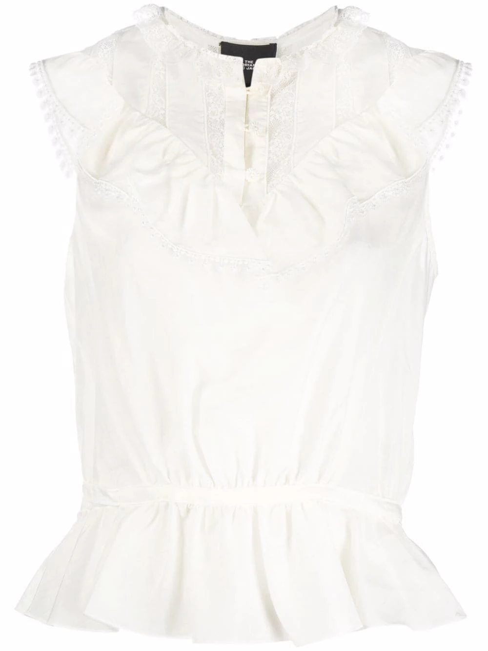Maille fine, détails de volants, design sans manches, encolure ronde.