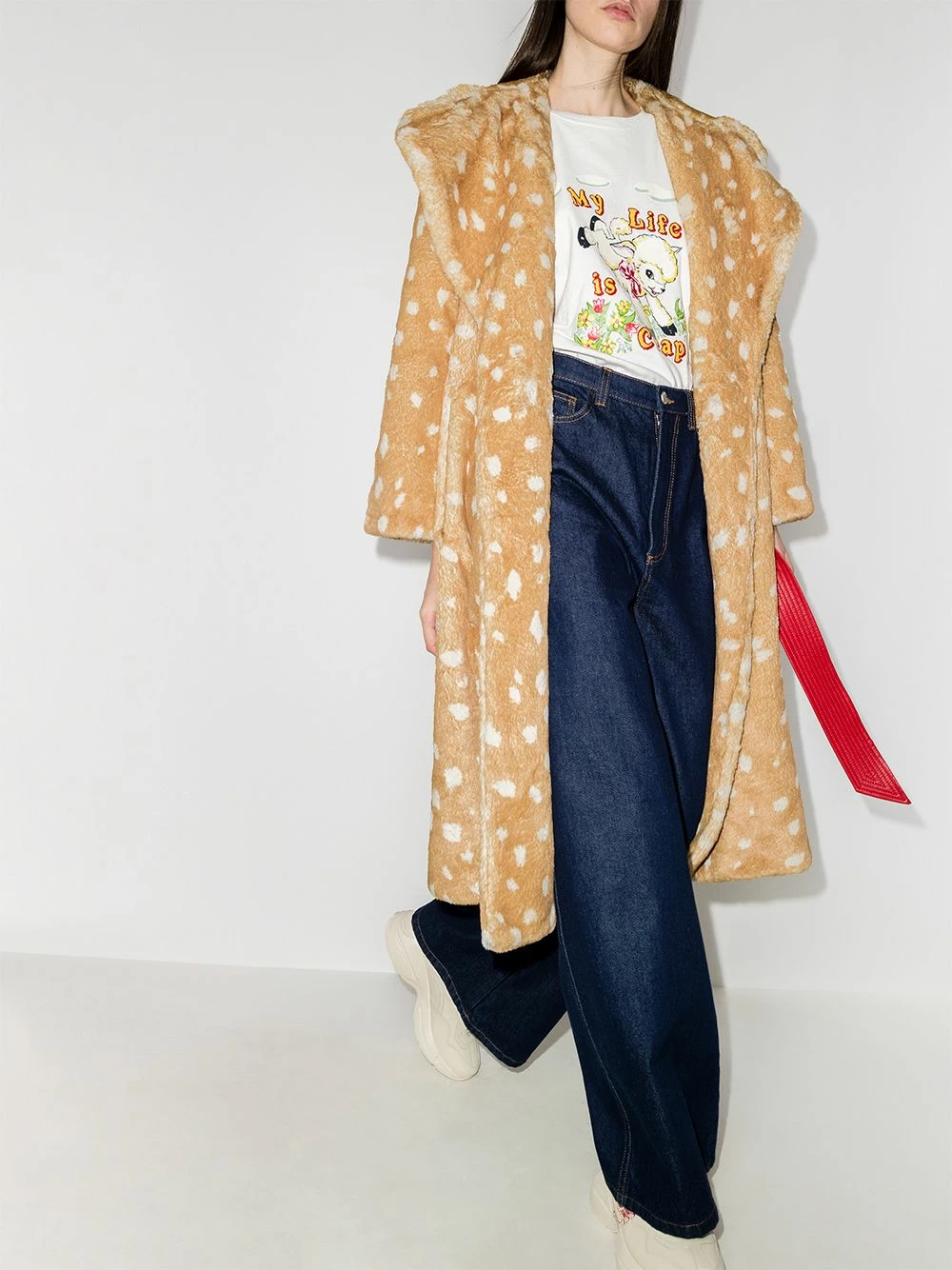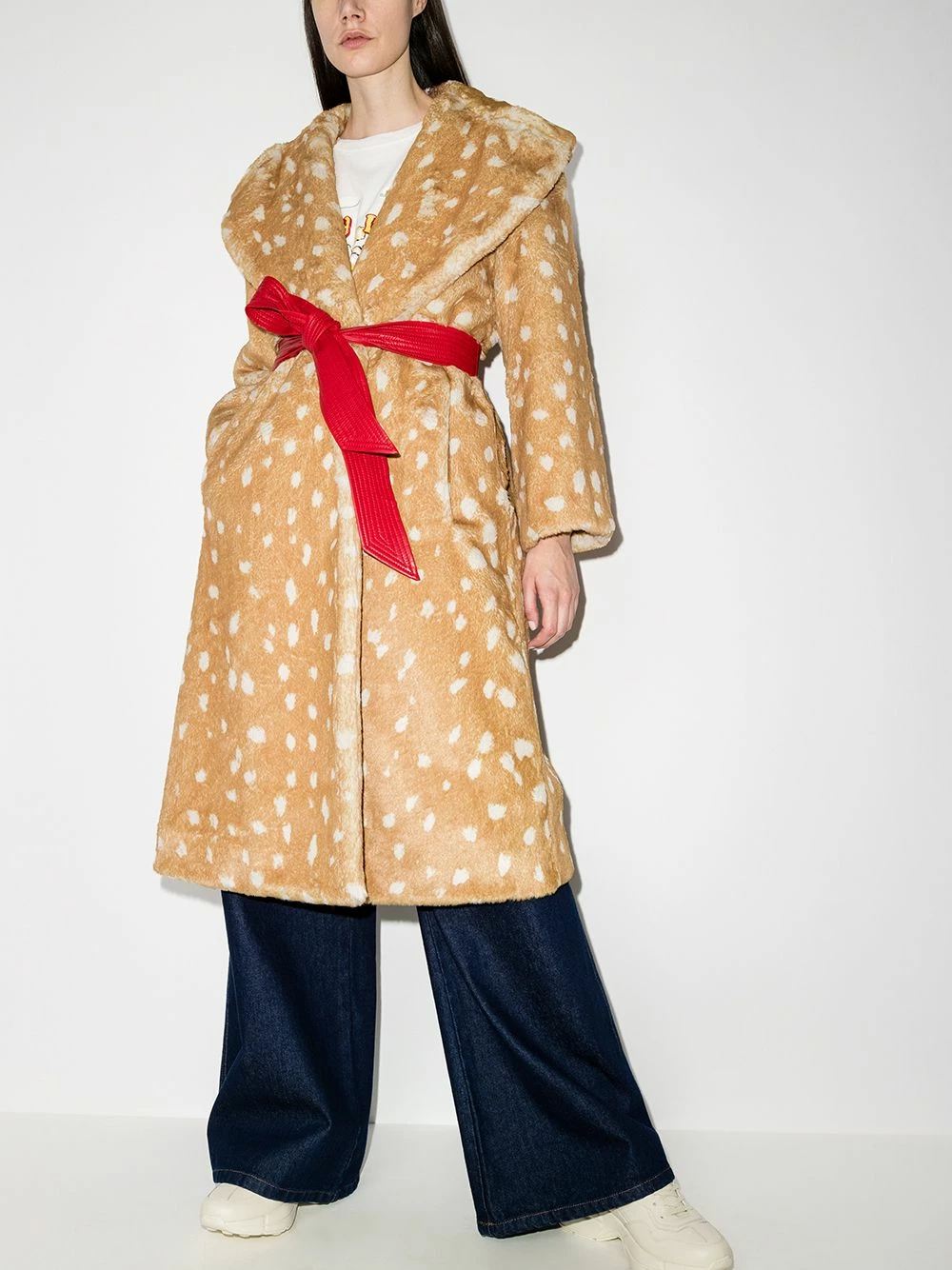 Imprimé animalier, col italien, taille nouée, manches longues, ourlet droit.